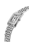 The Classics Carrée Small Seconds features a silvered dial with two central hands and an off-centred small seconds hand above a sector dial minute track, as well as large Roman numerals and a high-precision quartz movement. A chic, elegant timepiece that evokes the 1920s while offering a touch of modernity.