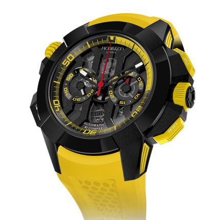 Jacob & Co. Epic X Chrono 47 mm watch. Model reference: EC313.21.SB.BV.D. Black DLC Grade 5 titanium case. Black ceramic bezel. Skeleton dial. Automatic movement. Yellow rubber strap and black DLC titanium folding clasp. Swiss made. Watch comes in original packaging, with set of documents and 2 years warranty. At IDS Jewelry we offer new authentic watches at the best prices.