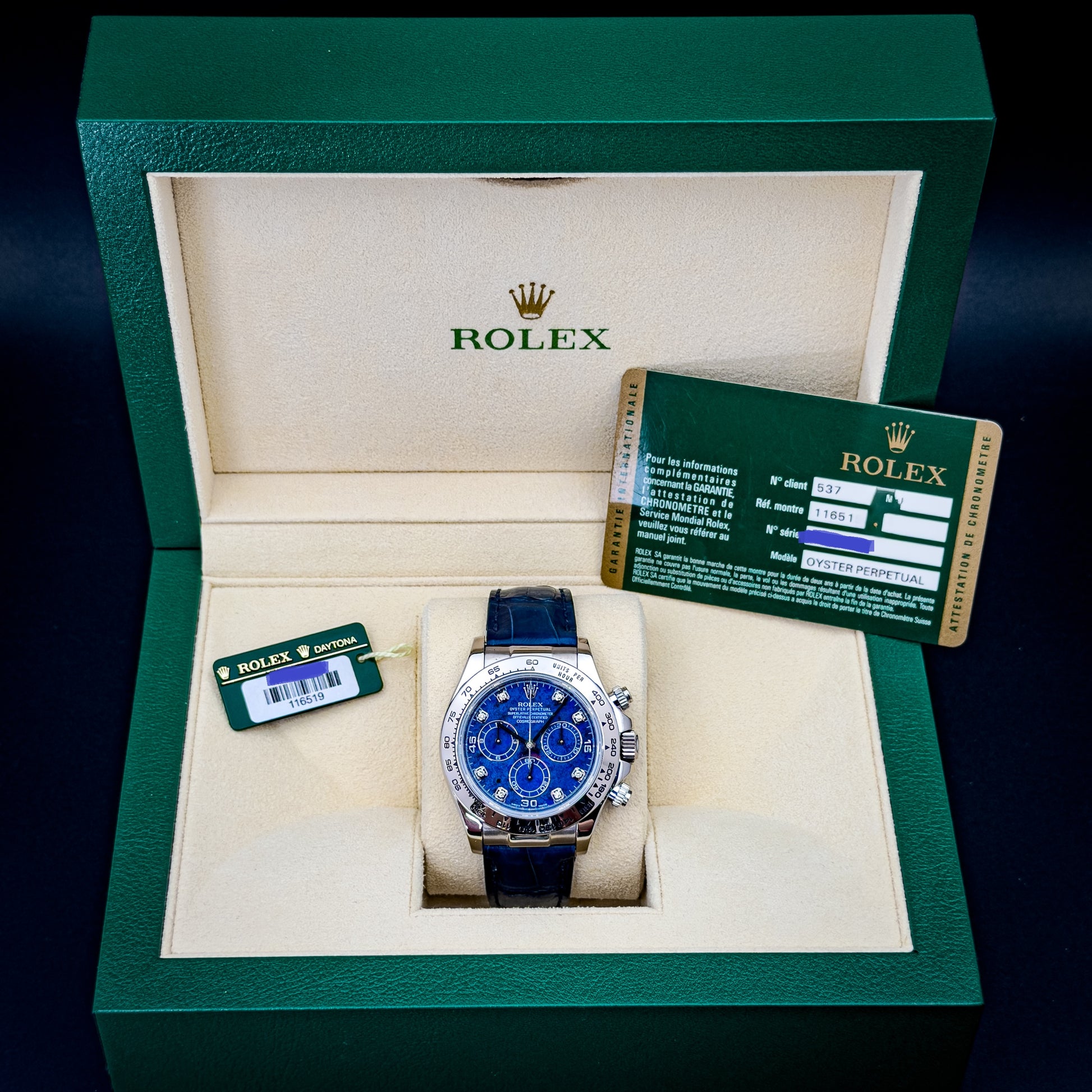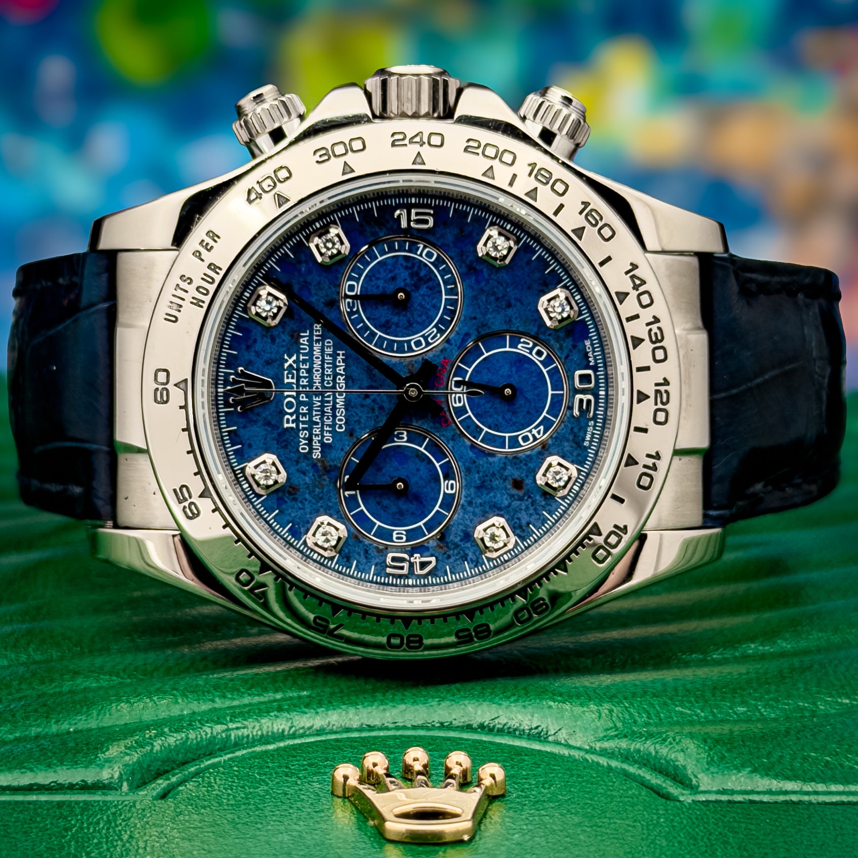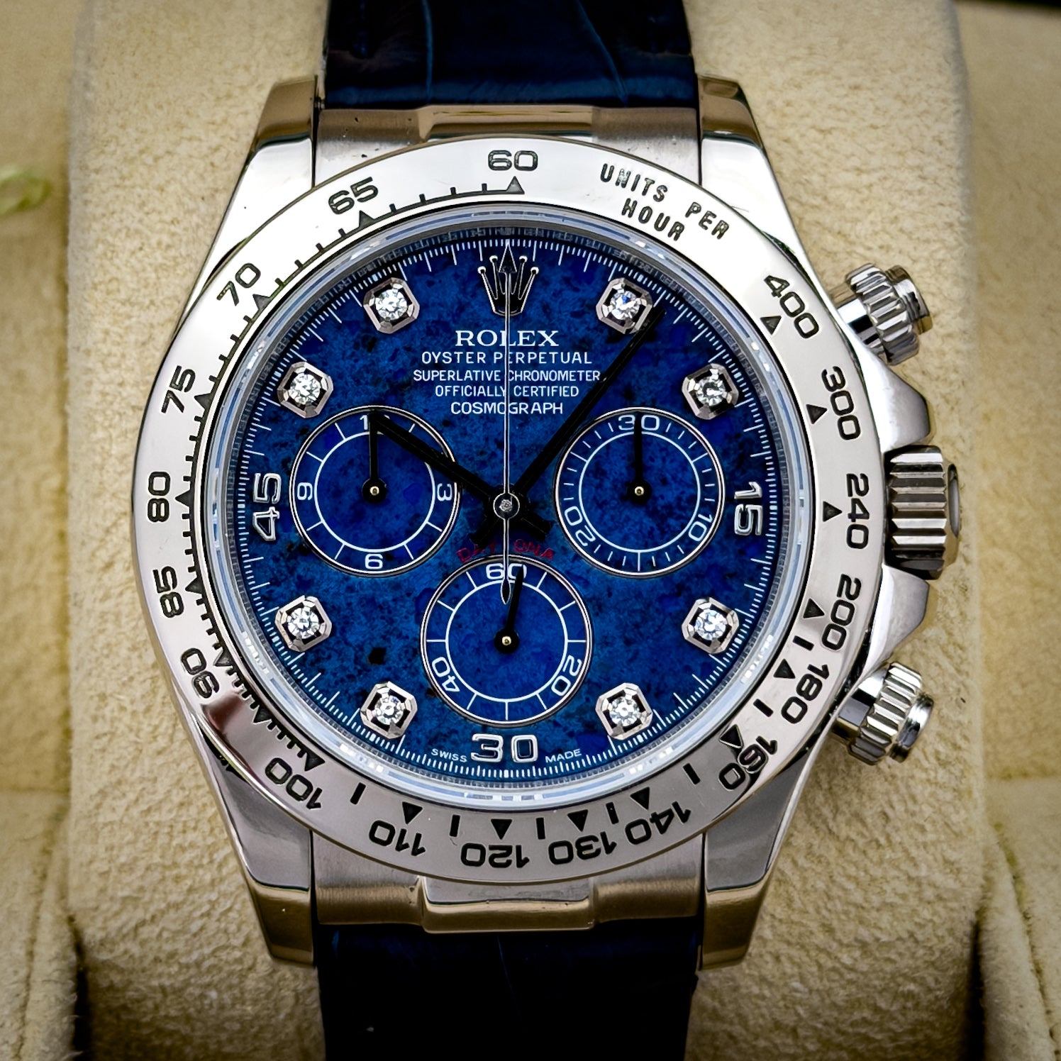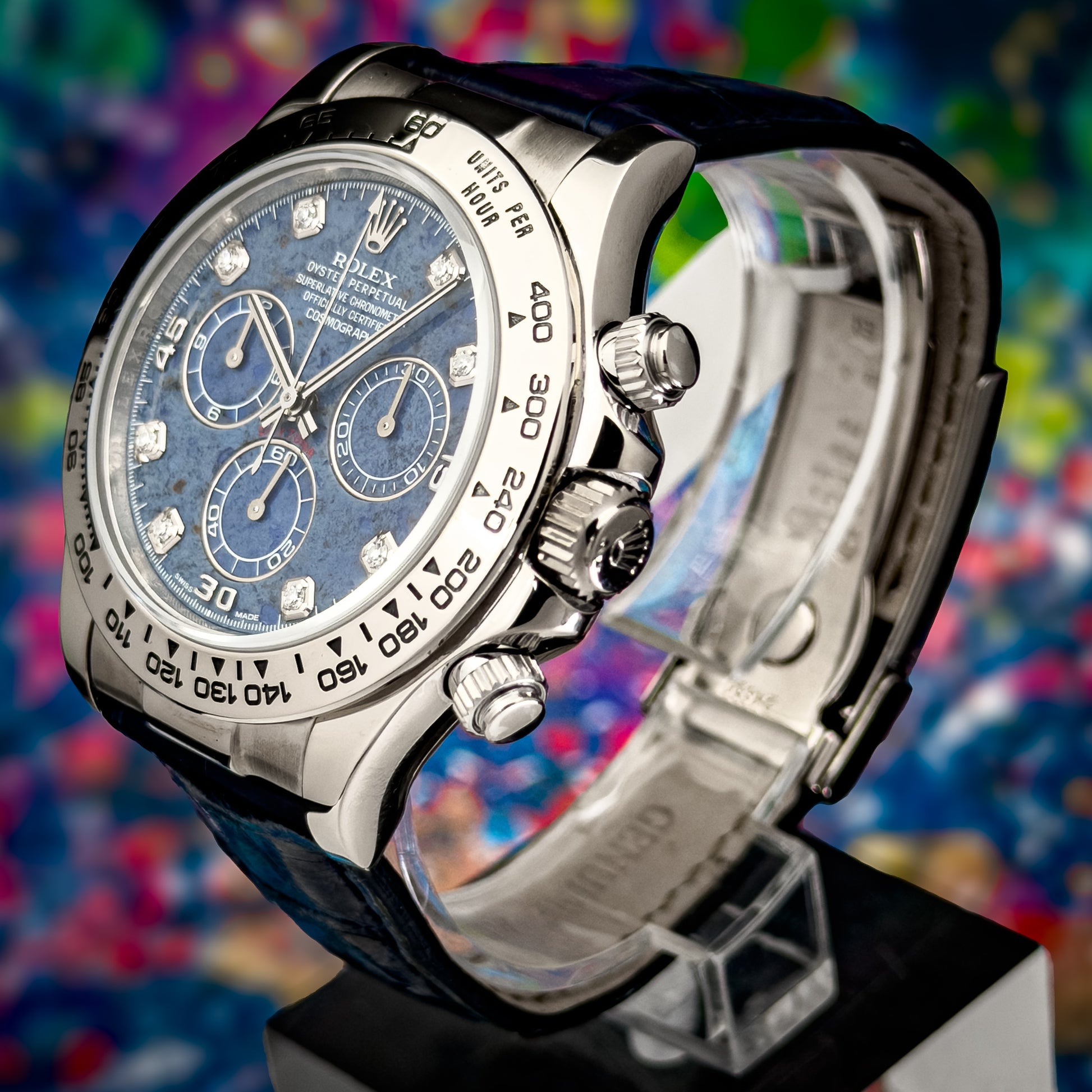 This Rolex Daytona 116519 features a rare factory sodalite stone dial, accented by diamond hour markers. Unlike traditional dials, sodalite is a natural material—meaning every piece carries its own unique pattern, depth, and tone. Under different lighting, it shifts from deep navy to vibrant electric blue.